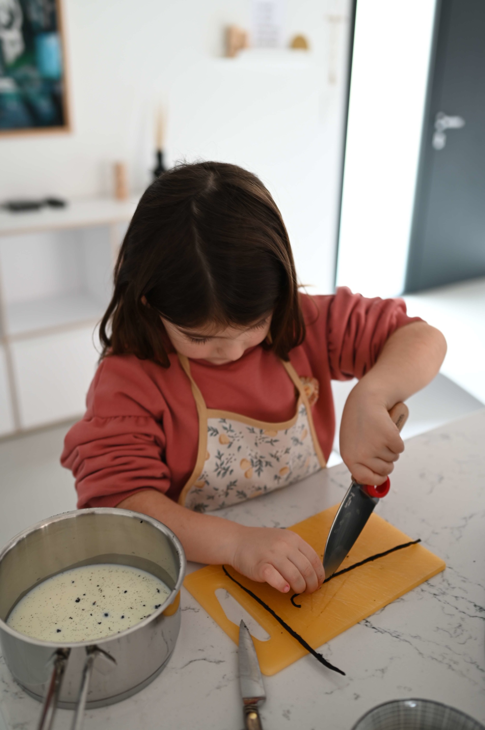 Débuter par la réalisation de la crème pâtissière : Commencer par fouetter les œufs avec le sucre jusqu’à ce que le mélange blanchisse. Ensuite ajouter la farine et mélangez. Ouvrir la gousse de vanille en 2 pour y récupérer les graines et ajoutez-les au lait dans une casserole. Faites chauffer le lait puis versez-le sur le mélange sucre/farine. Mélanger puis remettre le tout dans la casserole et faites épaissir à feu doux. Retirez du feu puis filmez votre préparation avec du film alimentaire au contact et laissez refroidir 1 heure environ.
